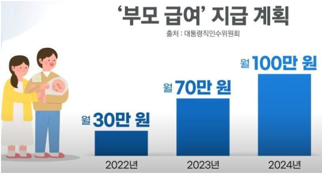 현재 영아수당으로 주고 있는 30만원을 각각 내년에는 70만원, 35만원으로 확대하고 2024년에는 만0세 100만원, 만1세는 50만원을 준다는 내용이네요.