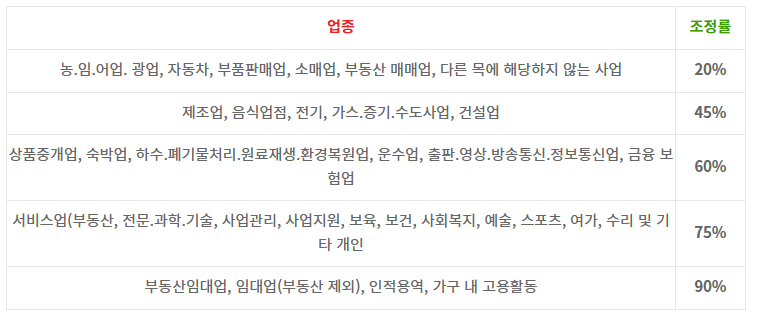자영업을 하시는 분들은 이번 반기에 신청은 대상자가 되지 않고 5월에 정기 신청을 하셔야 해요. 대신에 소득 기준이 나왔으니까 업종별 조정률을 한 번 보시면은 아래와 같아요.